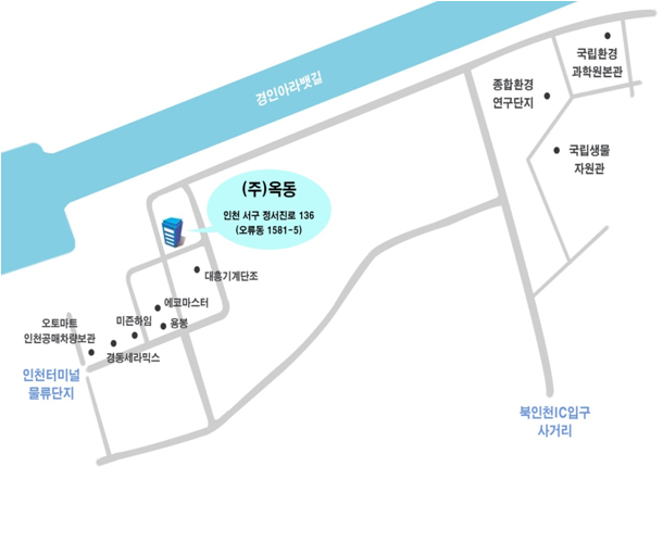 찾아오시는길 (주)옥동에 찾아오시는 길 안내입니다. 주소 인천광역시 서구 정서진로 136 (경인 아라뱃길 물류단지 內. 번지주소 : 오류동 1581-5번지) 위치설명 북인천IC 입구 사거리에서 강화-김포 방향으로 직진 후, 첫 번째 삼거리에서 좌회전. 1KM 직진. 삼거리에서 다리가 나오면 지나쳐서 바로 우회전 후 500M 가량 직진 하면, 우측 편에 은색 4층 건물입니다.